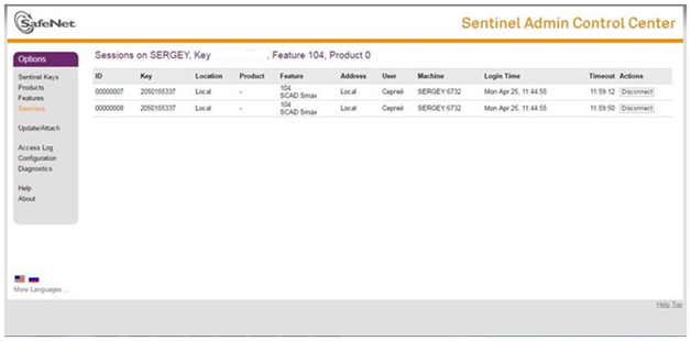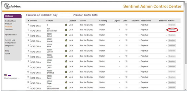 3. Для просмотра информации о том, какие именно пользователи заняли лицензии, нажмите кнопку «Sessions» (как показано на иллюстрации). Откроется детальный список сессий.